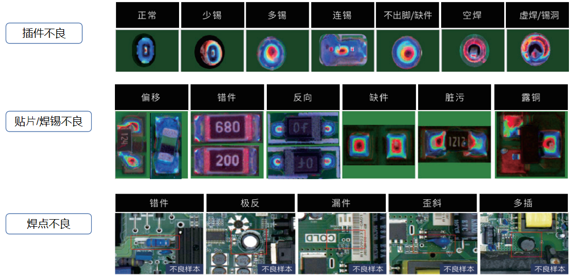 檢測相關(guān) | 元件檢測 | 手插元器件及貼片料的缺件、反轉(zhuǎn)、偏移、破損、歪斜、多插、異物、污損等 | ||||